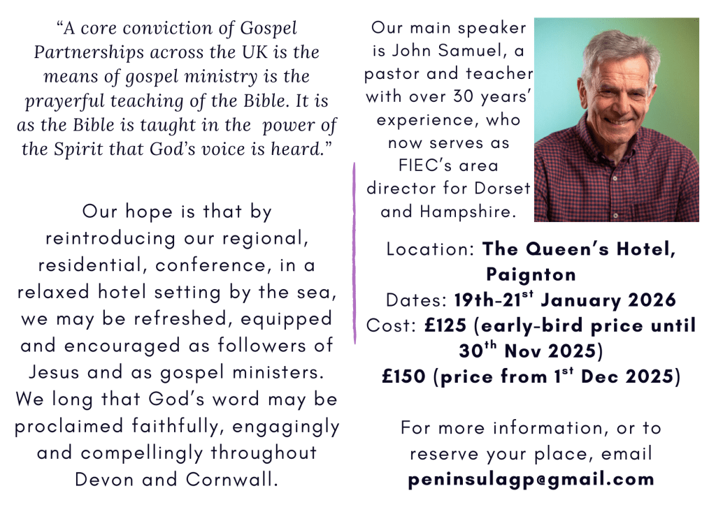 For next year’s Deepen conference, we’ve struck an excellent deal with the Queen’s Hotel, Paignton, to provide us with accommodation and meals. And we’re delighted that John Samuel, the FIEC’s area director for Dorset and Hampshire, and a regular contributor to Proclamation Trust conferences, will be joining us as our main speaker.